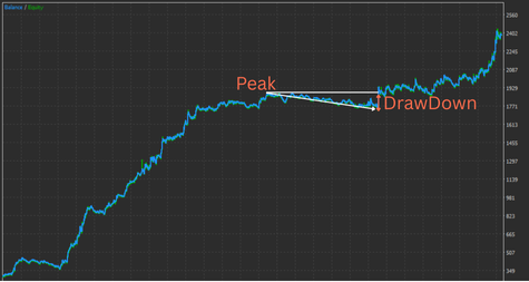Drawdown (DD) shows how far your account equity has dropped from its most recent peak.