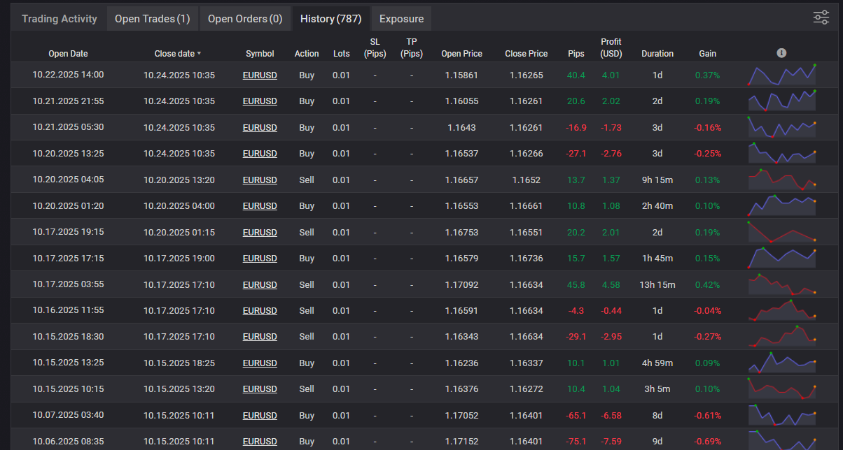 - You can’t react quickly if the provider suddenly changes approach (aggressive lot scaling, averaging down, etc.).