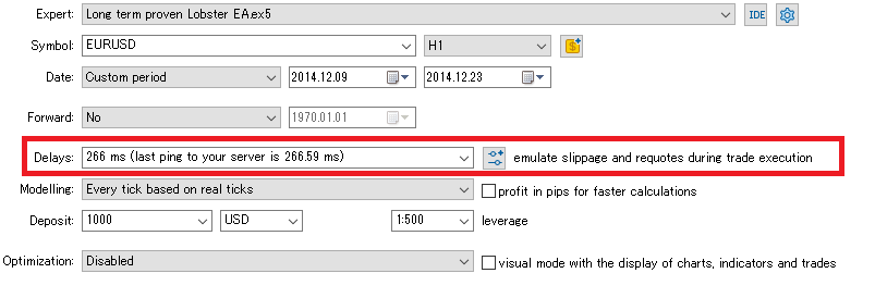 Delay settings in MT5 Strategy Tester. This feature can “approximate” slippage and requotes during execution.